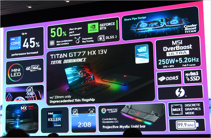 이번 신제품 발표회의 히어로 모델은 MSI의 모바일 기술이 집약된 플래그십 게이밍 노트북 ‘타이탄 GT77 HX’이다. CES 2023 혁신상을 수상한 이 노트북은 13세대 인텔 코어 i9-13980HX 프로세서와 엔비디아 지포스 RTX 4090 그래픽과 함께 세계 최초의 4K 미니 LED 디스플레이가 적용되어 현존 노트북 최고 수준의 성능과 압도적인 비주얼이 장점이다. 또한, DDR5 메모리와 PCIe Gen5 SSD 지원, 그리고 체리 MX 기계식 키보드 등 데스크톱 PC 이상의 환경을 제공한다.