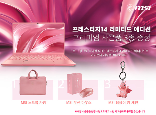 MSI '프레스티지14 A10SC 로즈핑크 에디션'은 기존 카본 그레이 및 화이트 에디션에 이어 출시된 제품으로 15.9mm, 1.29kg 초슬림 초경량 디자인에 우아한 로즈 핑크 컬러로 매력을 극대화했다. 해당 제품 구매 시 MSI 노트북 가방, 무선 마우스, 용용이 키 체인 3종 사은품이 증정되며, 사은품 소진 시 해당 이벤트는 예고 없이 종료될 수 있다.