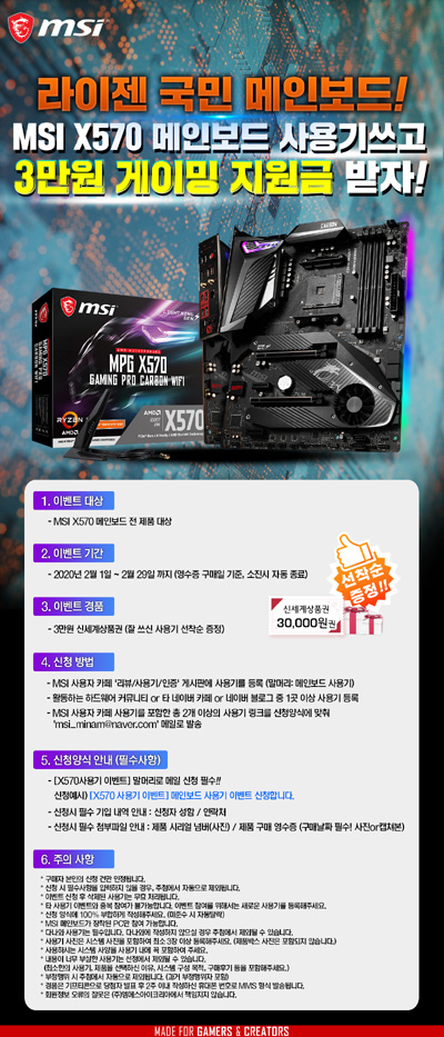 본 이벤트는 2월 1일(토)부터 2월 29일(토)까지 진행하며 MSI X570 칩셋 메인보드 전 제품을 구매한 모든 구매자를 대상으로 한다. 이벤트 경품은 ‘3만원 게이밍 지원금(신세계상품권)’으로, 우수한 사용기 작성자를 대상으로 추첨 선착순 증정 예정이다.
