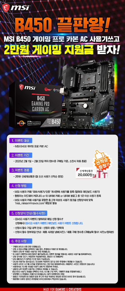 엠에스아이코리아 ‘MSI B450 게이밍 프로 카본 AC’ 메인보드 구매자를 대상으로 2만원 게이밍 지원금(신세계상품권)을 증정하는 이벤트를 진행한다.