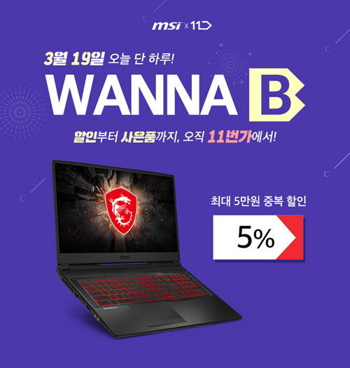 엠에스아이코리아는 11번가에서 MSI 노트북 원데이 워너비 기획전을 진행한다. 이번 워너비 기획전은 2020년 3월 19일 단 하루 동안 11번가에서 진행되며, 파격적인 중복 할인과 사은품 증정 등 2배의 혜택을 받을 수 있다.