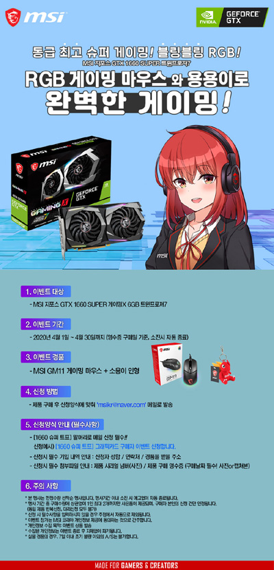 이번 행사는 2020년 4월 1일부터 4월 30일까지 ‘MSI 지포스 GTX 1660 SUPER 게이밍X 6GB 트윈프로져7’를 구매하는 고객에게 RGB 감성의 GM11 게이밍 마우스와 함께 ‘용용이 열쇠고리’ 증정한다. 준비된 경품이 모두 소진 시 행사는 자동으로 종료된다.