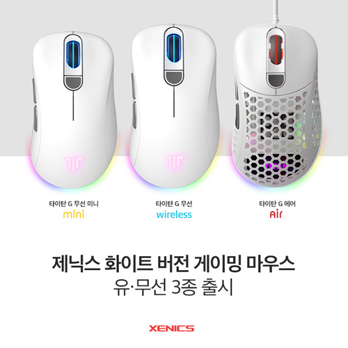 제닉스에서 타이탄 G 무선, 타이탄 G 미니 무선, 타이탄 G 에어 게임용마우스 화이트 색상을 출시한다.