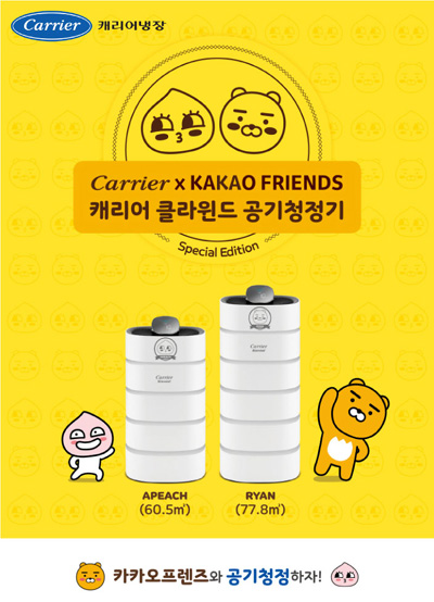 캐리어에어컨이 캐릭터 브랜드 카카오프렌즈와 콜라보레이션한 ‘캐리어 클라윈드 공기청정기’ 2종을 출시한다. 이번에 출시하는 제품은 ‘캐리어 클라윈드 어피치 공기청정기 18평형(64㎡’)’과 ‘캐리어 클라윈드 라이언 공기청정기 23평형(77㎡)’ 2종이다.