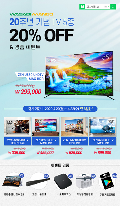 와사비망고는 창립 20주년 프로모션'을 실시한다. '창립 20주년 축하' 이벤트는 4월 20∼22일 3일간 진행되고 이벤트 참여를 통해 여러 경품을 추가 증정한다. 가격 할인부터 풍성한 사은품 증정까지 더욱 실질적인 구매 혜택들로 구성했다. 행사 기간 동안 주요 인기 UHDTV 와사비망고 제품 구매 시 20% 할인된 가격으로 구입이 가능하다.