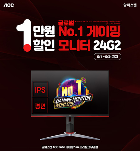 알파스캔 AOC가 144Hz 게이밍 모니터 24G2에 대해 특가 행사를 진행한다. 5월 1일부터 5월 31일까지 진행되는 이번 행사에서는 24G2를 정상가에서 1만원 할인된 309,000원에 구매할 수 있다.