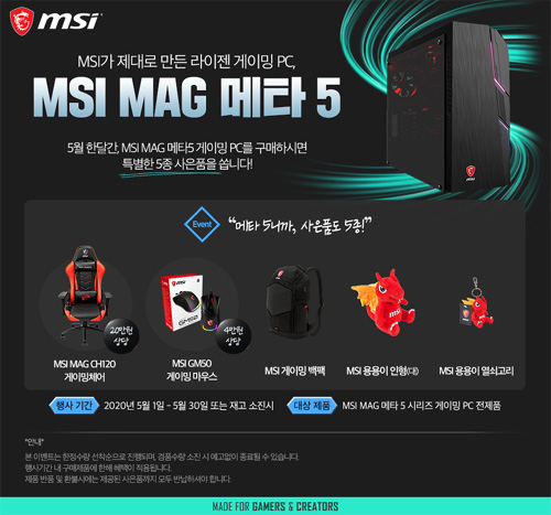 그 중에서도, AMD 라이젠 프로세서가 탑재된 ‘MSI 메타 5’는 전 구매 고객을 대상으로 20만 원 상당의 게이밍 체어, ‘MSI MAG CH120’과 함께 백팩, 캐릭터 인형 등 특별한 5종 경품을 추가로 제공, 가격 할인과 함께 더 큰 혜택이 제공된다.