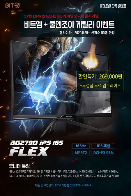 비트엠은 27형 화면에 QHD 고해상도와 165Hz의 화면재생률, IPS 광시야각 패널을 넣은 게이밍 모니터 ‘Newsync BG279Q IPS 165 FLEX’ 출시를 기념하는 특가전을 진행한다.
