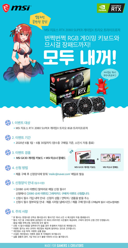 이번 행사는 2020년 6월 1일부터 6월 31일까지 ‘MSI 지포스 RTX 2080 SUPER 게이밍X 트리오 8GB 트라이프로져’를 구매하는 고객에게 화려한 RGB와 함께 다양한 기능이 포함된 ‘MSI GK30 게이밍 키보드’와 함께 인싸템 ‘미소녀 장패드’를 증정한다. 준비된 경품이 모두 소진 시 행사는 자동으로 종료된다.