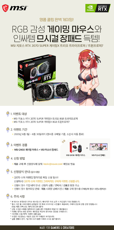 이번 행사는 2020년 6월 1일부터 6월 30일까지 ‘MSI 지포스 RTX 2070 SUPER 게이밍X 8GB 트윈프로져7’, ‘MSI 지포스 RTX 2070 SUPER 게이밍X 트리오 8GB 트라이프로져’를 구매하는 고객에게 RGB LED와 함께 다양한 게이밍 기능이 탑재된 ‘MSI GM30 게이밍 마우스’와 함께 인싸템 ‘MSI 미소녀 장패드’를 증정한다. 준비된 경품이 모두 소진 시 행사는 자동으로 종료된다.