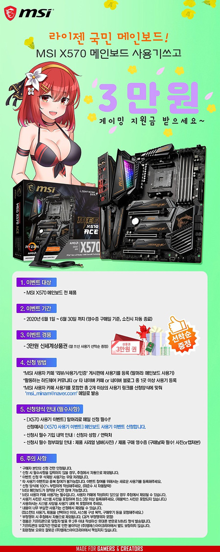 X570 구매자 이벤트는 6월 1일(월)부터 6월 30일(화)까지 진행하며(기간 중 구매 고객 대상, 경품 소진 시 자동 종료) 이벤트 기간 중 MSI X570 메인보드(단, 대상 제품 확인 필수)를 구매한 모든 고객을 대상으로 한다. 이벤트 경품으로는 ‘MSI 미소녀 장패드’를 선착순으로 증정한다.