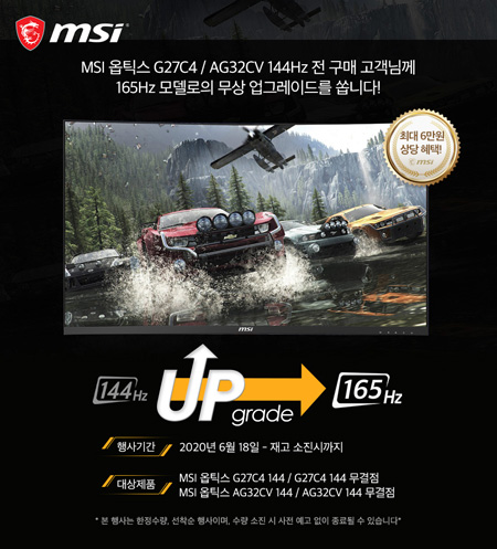 2020년 6월 18일부터 한정 수량으로 진행되는 이번 이벤트는, 뛰어난 가격대 성능으로 시장에서 좋은 반응을 얻어왔던 ‘MSI 옵틱스 G27C4 144’와 ‘MSI 옵틱스 G27C4 144 무결점’, ‘MSI 옵틱스 AG32CV 144’, ‘MSI 옵틱스 AG32CV 144 무결점’ 4개의 제품을 대상으로 진행되며, 행사기간동안 이들 제품을 구매하는 모든 구매 고객에게 144Hz 주사율을 165Hz 주사율로 무상 업그레이드가 제공된다.