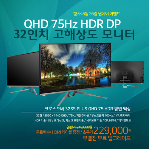 크로스오버존은 대표모니터 '크로스오버 32SS PLUS QHD 75 HDR 평면 떡상 무결점’을 대상으로 특가 이벤트를 진행한다. 행사는 6월 26일 금요일 옥션 올킬을 대상으로 진행된다. 행사 기간 동안 32SS PLUS QHD 75 HDR 평면 떡상 무결점은 행사가 229,000원에 판매된다. 구매자의 부담을 덜기 위해 배송비는 무료로 진행되며 HDMI 케이블을 무료로 증정한다. 준비된 수량은 100개이며, 모두 소진되면 행사는 종료된다.