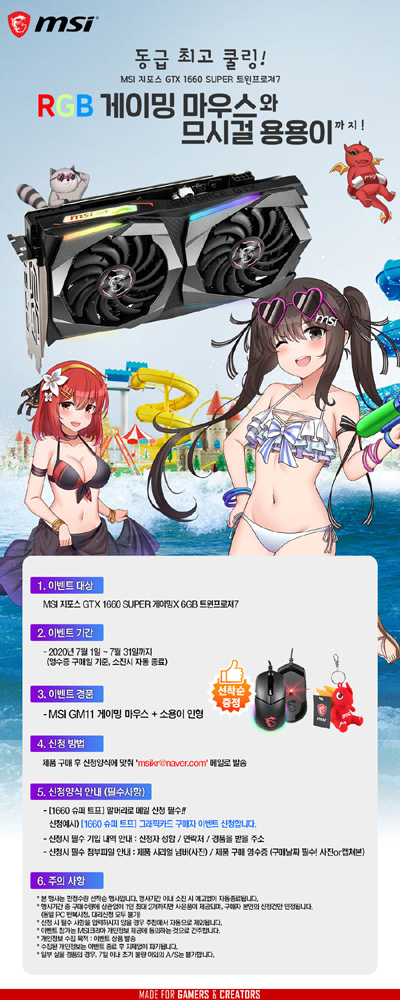 이번 행사는 2020년 7월 1일부터 6월 31일까지 ‘MSI 지포스 GTX 1660 SUPER 게이밍X 6GB 트윈프로져7’를 구매하는 고객에게 RGB 감성의 ‘GM11 게이밍 마우스’와 함께 MSI 마스코트 ‘용용이 열쇠고리’를 증정한다. 준비된 경품이 모두 소진 시 행사는 자동으로 종료된다.