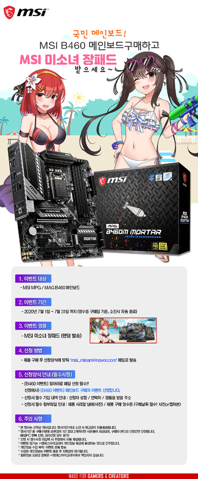 엠에스아이코리아는 ‘MSI 미소녀 장패드’를 증정하는 MSI B460 메인보드 구매 이벤트를 진행한다.