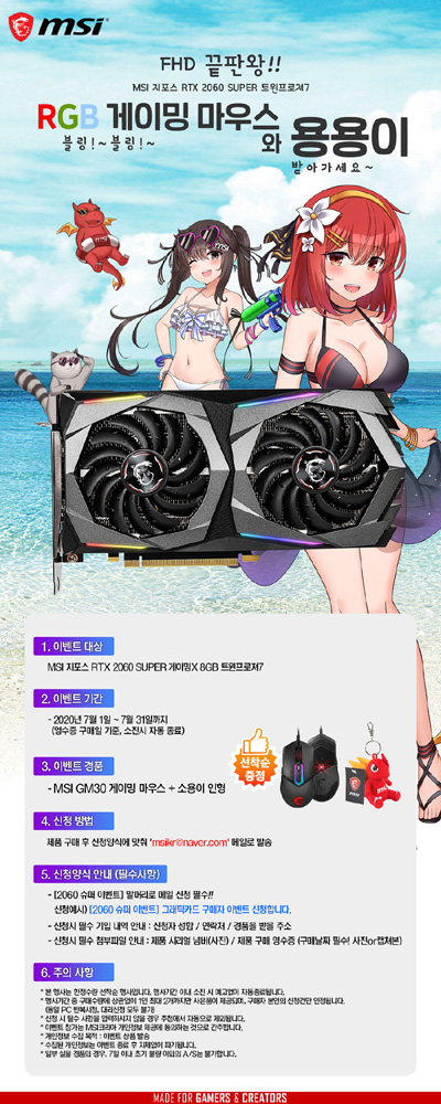 이번 행사는 2020년 7월 1일부터 7월 31일까지 ‘MSI 지포스 RTX 2060 SUPER 게이밍X 8GB 트윈프로져7’를 구매하는 고객에게 화려한 RGB와 다양한 게이밍 기능을 갖춘 ‘GM30 게이밍 마우스’와 함께 ‘용용이’ 인형 등 총 10만원 상당의 경품을 증정한다. 준비된 경품이 모두 소진 시 행사는 자동으로 종료된다.