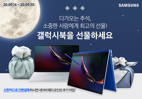 엔씨디지텍에서 갤럭시북 인기모델(갤럭시북 이온/갤럭시북 플렉스/갤럭시북 플렉스 알파/갤럭시북S)들을 대상으로 9월16일부터 9월30일까지 네이버 갤럭시북 추석 선물전 행사를 진행한다.