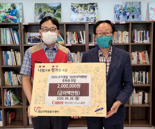 캐논코리아 비즈니스 솔루션은 안산시 자원봉사센터에서 주최하는 2020 추석명절 전 나눔 ‘전(煎)부쳐핸썸’ 행사에 200만 원의 기부금을 전달했다. 해당 기부금은 자원봉사센터를 통해 지난 26일(일) 안산 관내 독거노인, 저소득층 가정 등 총 500가구에게 추석 전과 떡으로 전달됐다. 캐논코리아 비즈니스 솔루션 임직원은 센터와 함께 전 부치기 봉사활동을 진행할 예정이었으나, 코로나19로 인해 기부금 전달로 마음을 대신 전하였다. 후원을 통해 따뜻한 한가위 정(情)을 선물했다.