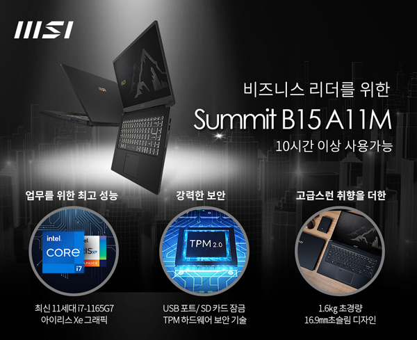 '써밋 B15 A11M'은 인텔 i7-1165G7 프로세서 및 아이리스 Xe 그래픽을 탑재했다. 16.9mm, 1.6kg 초슬림 초경량 디자인과 견고한 블랙 알루미늄 바디로 고급스러운 디자인을 완성했다. 180도 오픈 힌지를 적용하여 회의 시 화면 공유가 용이하다. 10시간 사용 가능한 배터리로 출장, 미팅 등의 환경에서도 장시간 업무에 집중할 수 있으며, 강력한 TPM 보안 기술을 적용했다.
