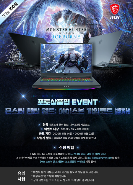 엠에스아이코리아는 MSI 하이엔드 게이밍 노트북 구매 시 ’몬스터 헌터 월드: 아이스본’ 게임 코드를 증정한다. 이번 상품평 이벤트는 2020년 11월 22일까지 진행되며, 코드 사용 기간은 2020년 12월 31일까지다. 선착순 100명 한정으로, 코드 소진 시 본 행사는 예고 없이 종료될 수 있다.