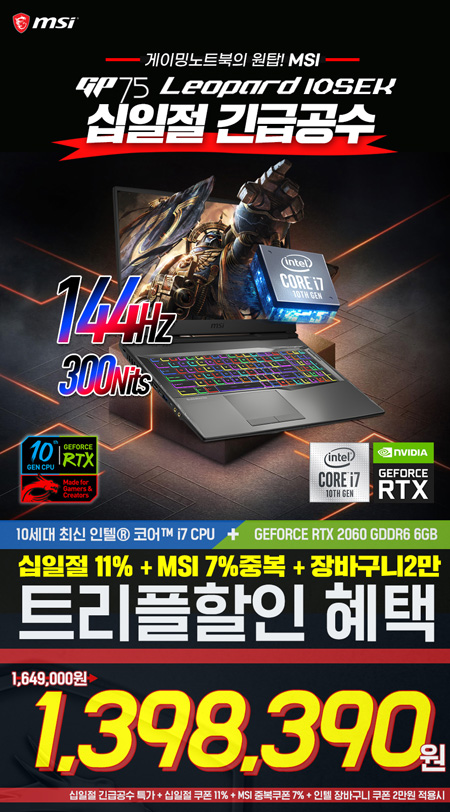 엠에스아이코리아는 MSI ‘GP75 Leopard 10SEK’ 게이밍 노트북 긴급공수 특가 행사를 진행한다. 이번 긴급공수는 11월 03일(화) 하루 한정으로 진행될 예정이며, 쇼킹딜 긴급공수 특가에 그랜드 십일절 PC 11%(최대 20만 원) 즉시 할인 및 7%(최대 7만 원) MSI 노트북 중복 쿠폰이 적용된다. 거기에 인텔 장바구니 쿠폰 2만 원까지 증정하여 최종 혜택가 1,398,390원에 구매가 가능하다.