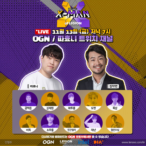 엑스맨 오브 리전은 레노버의 게이밍 브랜드 리전(Legion)과 CJ ENM 다이아 티비 OGN이 공동 주최하고 인텔이 후원하는 이벤트성 대회로, 2019년 다이아 티비가 처음 개최한 국내 최초 게임 크리에이터 축제 게임콘의 외전 성격으로 진행된다. 게임 크리에이터들이 두 팀으로 나뉘어 다양한 게임으로 경쟁을 하는 이 행사는 MC ‘단군’ 김의중의 사회로 진행되며, 팀의 주장을 맡은 ‘따효니’ 백상현과 ‘침착맨’ 이병건을 비롯해 김재원, 공혁준, ‘꽈뚜룹’ 장지수, ‘도현’ 김도현, ‘머독’ 박진수, ‘룩삼’ 김진효, ‘소우릎’ 서현석, ‘인간젤리’ 곽석호, ‘재넌’ 이재원, ‘철면수심’ 김종수 등 화려한 캐스팅 라인업을 자랑한다.