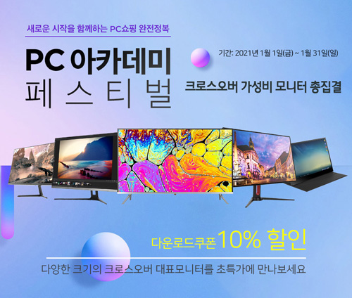 이번 행사동안 크로스오버의 포터블, 24, 27, 32, 40형, 고해상도, 고Hz, 평면, 게이밍 등 다양한 모니터들이 저렴하게 판매된다. 11번가 1월 PC아카데미 프로모션 상품들은 컨텐츠 내에 ‘PC아카데미 페스티벌’ 배너가 위치하며, 이를 클릭하면 10% [모니터/프린터] 할인쿠폰을 내려받아 사용할 수 있다.