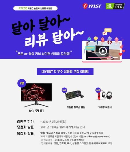 엠에스아이코리아는 지포스 RTX 30 게이밍 노트북 런칭 기념 포토/영상 상품평 이벤트를 진행한다 '우수 상품평 추첨 이벤트'의 접수는 2021년 2월 28일(일)까지 진행된다.