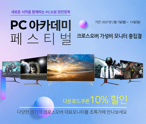 이번 행사 동안 크로스오버의 24, 27, 32,34, 38, 43형, 고해상도, 고Hz, 평면, 커브드, 게이밍 등 다양한 모니터들이 저렴하게판매된다. 11번가 2월 PC아카데미 프로모션 상품들은 컨텐츠내에 ‘PC아카데미 페스티벌’ 배너가 위치하며, 이를 클릭하면 10% [모니터/프린터] 할인쿠폰을 내려받아 사용할 수 있다. 행사기간은 2월 1일 월요일부터 2월 14일일요일까지 펼쳐진다. 아래 링크를 통해 크로스오버의 다양한 제품들을 저렴한 가격에 만나볼 수 있다.