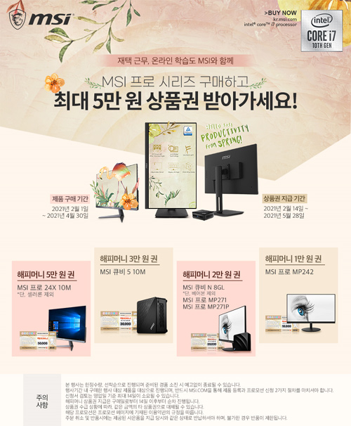 2021년 2월 1일부터 2021년 4월 30일까지 진행되는 이번 프로모션은 MSI의 프로 시리즈 제품군인 일체형 PC와 미니 PC, 모니터 구매고객을 대상으로 제품 구매 후 MSI 공식 홈페이지를 통해 제품 등록 및 이벤트 참여를 완료하면 구매 제품에 따라 최대 5만 원의 해피머니 상품권을 증정한다.
