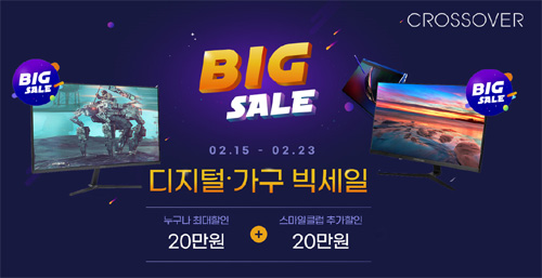 빅세일 상품들은 대표 이미지에 우주 모양의 빅세일스티커가 붙게되며, 이 경우 스마일클럽 회원은 최대 20% 할인쿠폰을 받아 사용할 수 있다. 행사기간은 2월 15일 월요일부터 2월 23일화요일까지 다양하게 펼쳐진다. 크로스오버의 다양한 제품들을 저렴한 가격에 만나볼 수있다.