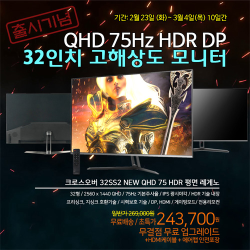 크로스오버존은 32인치 모니터 32SS 시리즈의 최신작 '32SS2 NEW QHD 75 HDR 평면 레게노’를 대상으로 출시기념 이벤트를 펼친다.