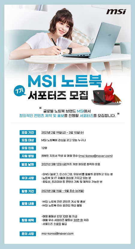 엠에스아이코리아는 ‘MSI 노트북 서포터즈 7기’를 모집한다. MSI 노트북 서포터즈는 2018년부터 이어져온 대외활동 프로그램으로 올해로 일곱 번째 기수를 모집하고 있다. MSI 노트북에 관심을 갖고 있는 누구나 지원 가능하며, MSI 카페에서 지원서를 받아 2021년 3월 10일 수요일까지 이메일( msi-korea@naver.com )로 접수하면 된다.