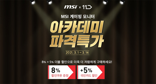 MSI는 오픈 마켓 11번가에서 열리는 PC 아카데미 기획전을 통해 게이밍 모니터 특가 판매를 진행한다.