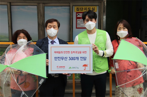 캐논코리아 비즈니스 솔루션이 ‘안전우산 제작하기’ 봉사활동에서 제작한 총 300개의 안전우산을 소외계층 아동들에게 27일 전달했다.