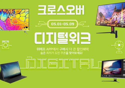 위매프에서 진행하는 이번 행사에서는 다양한 모니터가 판매될 예정이다. 이번 디지털위크 행사기간은 5/1(토) ~ 9(일)까지 진행된다.