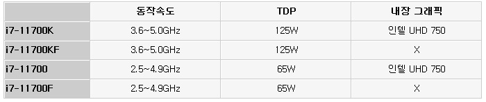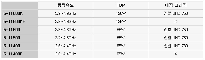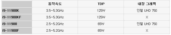 11세대 인텔코어 프로세서는 상단의 표와 같이 다양한 제품들이 출시되어 있다. 메인스트림급 모델인 i5 시리즈를 비롯해 하이 퍼포먼스를 지향하는 유저를 위한 i7 시리즈, 극한의 퍼포먼스를 구현하고 싶은 유저를 위한 i9 프로세서가 판매되어 비용이나 성능에 따라 제품을 선택할 수 있다.