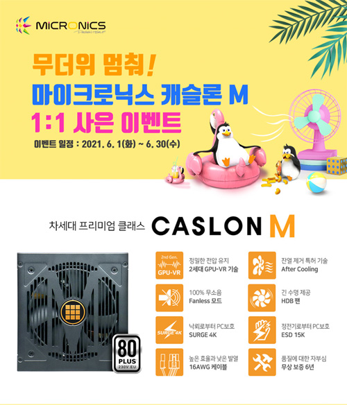 마이크로닉스는 자사의 프리미엄 파워서플라이 라인업 ‘캐슬론 M 시리즈’를 대상으로 경품 증정 이벤트를 진행한다.