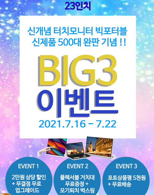 7월 16일 금요일부터 7월 22일 목요일까지스토어팜 단독으로 진행하는 이번 행사는 기존에 진행했던 이벤트에서 방식을 바꿔 네이버 행사가 299,000원에서 추가 2만원 할인을 실시해 실구매가 279,000원으로 진행한다. 여기에 2만원 상당의 플렉서블 거치대를 사은품으로증정한다. 빅포터블 모니터를 안정적으로 사용하기 위해서는 플렉서블 거치대는 필수다. 행사는 선착순 100대 한정으로 진행되며 무료로 무결점 업그레이드해서 출고된다. 포토상품평 작성시 모바일 상품권 5,000원도지급하며, 고객의 부담을 덜기 위해 배송비는 무료로 발송된다. 무더운 여름 모기 때문에 고생하는 사람들을 위해모기퇴치 벅스링도 같이 증정한다.