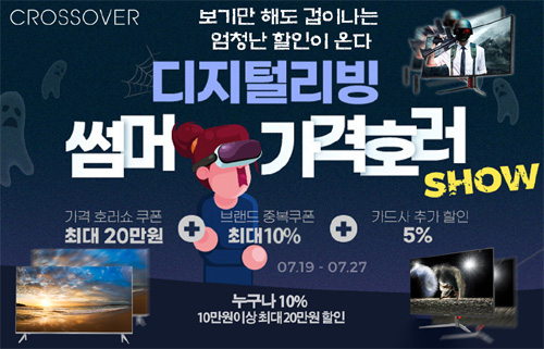 이번 행사동안 크로스오버의 포터블, 27, 32,34, 43형 등 다양한 모니터들이 저렴하게 판매된다. 가격호러쇼 행사기간 동안 가격 호러쇼 쿠폰이발행되며, 이를 내려받으면 최대 10% 할인쿠폰을 사용할 수 있다. 행사기간은 7월 19일 월요일부터 27일 화요일까지 다양하게 펼쳐진다. 아래 링크를 통해 크로스오버의 다양한 제품들을 저렴한 가격에 만나볼 수 있다.