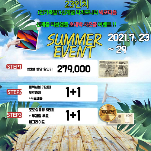7월 23일 금요일부터 7월 29일 목요일까지스토어팜 단독으로 진행하는 이번 행사는 기존에 진행했던 이벤트와 방식을 바꿔 네이버 행사가 299,000원에서 추가 2만원 할인을 실시해 실구매가 279,000원으로 진행한다. 이때 2만원 상당의 전용 플렉시블 거치대를 무료로증정하는데, 행사는 선착순 100대 한정으로 진행되며 무료로 무결점 업그레이드해서 출고된다. 포토상품평 작성시 모바일 상품권 5,000원도지급하며, 고객의 부담을 덜기 위해 배송비는 무료로 발송된다.