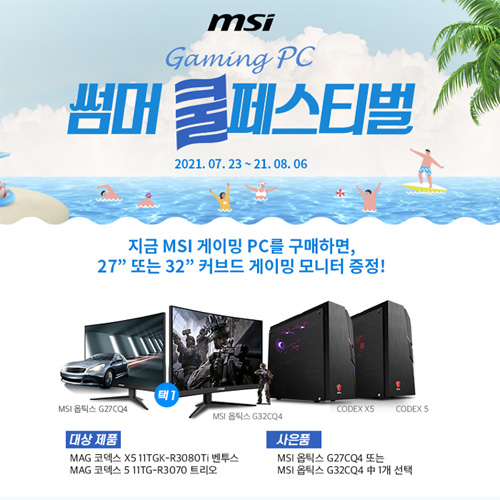 2021년 7월 23일부터 8월 6일까지 진행되는 이번 행사는 최신의 인텔 11세대 코어 i7 프로세서와 엔비디아 지포스 RTX 3080, RTX 3070 그래픽카드를 탑재한 ‘MSI MAG 코덱스 X5’, ‘MSI MAG 코덱스 5’ 구매자에게 40만 원 상당의 27형 또는 32형 커브드 게이밍 모니터 중 1대가 사은품으로 제공된다.또한, 인텔 11세대 코어 i5 프로세서와 엔비디아 지포스 RTX 3060 그래픽카드가 탑재된 ‘MSI MAG 코덱스 5’는 약 14만 원의 할인 혜택을 적용, 1,599,0000원에 구매가 가능하다.