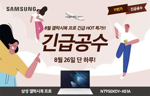 유니씨앤씨는 15.6인치 AMOLED 디스플레이 탑재와 초슬림 초경량 디자인으로 뛰어난 휴대성을 자랑하는 삼성 갤럭시북 프로 NT950XDY-A51A 모델을 대상으로 최대 33만원 추가 할인과 함께 푸짐한 사은품이 주어지는 ‘긴급공수’ 프로모션을 2021년 8월 26일 단 하루 동안 11번가를 통하여 단독 진행한다.
