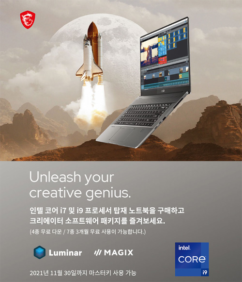 MSI는 인텔 11세대 및 10세대 프로세서(i9, i7)가 탑재된 MSI 노트북을 구매하는 고객에게 약 58만원 상당의 '크리에이터 소프트웨어 패키지'를 증정하는 프로모션을 진행한다고 밝혔다.