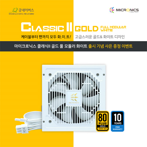 마이크로닉스는 80 플러스 골드 등급의 뛰어난 출력 성능에 화이트 색상의 깔끔한 디자인까지 입힌 프리미엄 파워서플라이 클래식 II 골드 풀모듈러 화이트 출시를 기념, 10월 31일까지 다양한 이벤트를 진행한다.