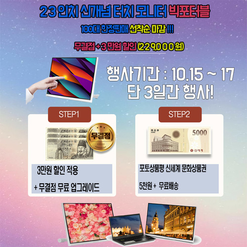 네이버 스마트스토어에서 진행하는 이번 행사는 기존정가에서 할인폭을 높여 특별한 가격인229,000원에 판매된다. 가격 할인폭이 높은 만큼 행사는 10월 15일금요일부터 17일 일요일까지 딱 3일만 진행된다. 행사는 선착순 100대 한정으로 진행되며 무료로무결점 업그레이드해서 출고된다. 포토상품평 작성시 모바일 상품권 5,000원도지급하며, 고객의 부담을 덜기 위해 배송비는 무료로 발송된다.