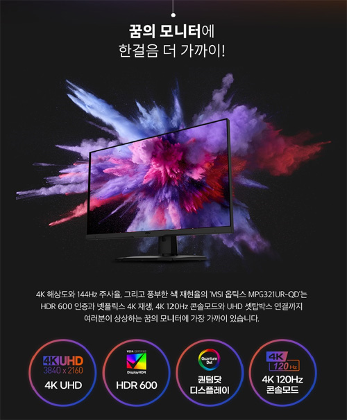 ‘꿈의 모니터에 한 걸음 더 가까이!’라는 메시지와 함께 모습을 드러낸 ‘MSI 옵틱스 MPG321UR-QD’는 4K UHD(3840*2160)의 초고해상도와 144Hz 주사율, VESA로부터 인증을 획득한 HDR 600, 퀀텀닷 디스플레이 기술 등 역대급 사양으로 하이엔드 게이밍 모니터에 대한 사용자의 모든 기대를 충족시킨다.