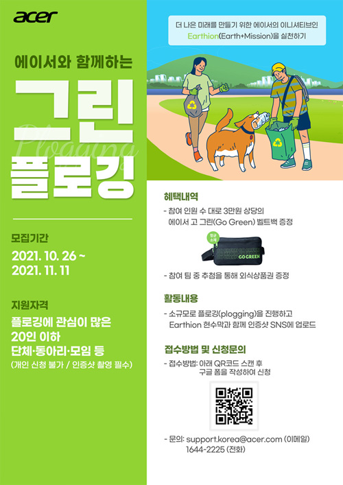 에이서가 ESG 경영 실천의 일환으로 진행 예정인 에이서와 함께 하는 그린 플로깅 캠페인에 참여할 단체를 모집한다.