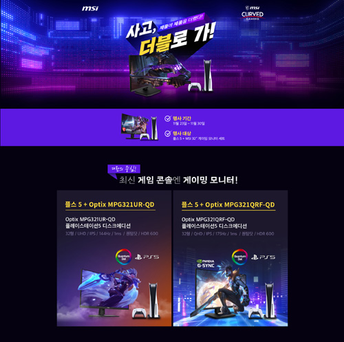 엠에스아이코리아는 G마켓과 옥션에서 MSI 게이밍 모니터와 플레이스테이션 5 패키지 판매 행사를 연다. 2021년 11월 23일부터 30일까지 G마켓과 옥션에서 열리는 패키지 판매 행사는 50대 한정 수량으로 진행된다. 행사 대상 게이밍 모니터는 각각 ‘MSI 옵틱스 MPG321UR-QD’와 ‘MSI 옵틱스 MPG321QRF-QD’ 이다.