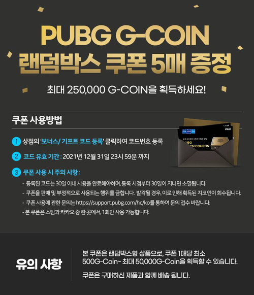 엠에스아이코리아는 인텔 11세대 게이밍 노트북 대상으로 PUBG G-COIN 랜덤박스 쿠폰 증정 이벤트를 진행한다. 이벤트는 11번가와 G마켓에서 2021년 11월 26일부터 12월 31일까지 진행된다. 인텔 11세대 MSI 게이밍 노트북을 구매하면 PUBG 게임에서 사용할 수 있는 G-COIN 쿠폰 5매를 제공한다. 쿠폰 금액은 1매당 500~50,000 G-COIN으로 최대 250,000 G-COIN을 획득할 수 있다.